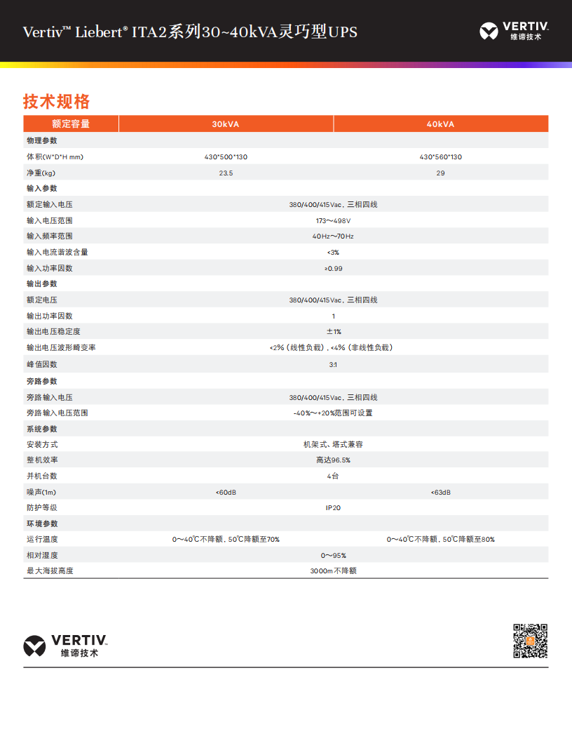 您的位置:首页 > 产品中心 > UPS电源产品中心 > 维谛USP电源专区 > Vertiv Liebert ITA2系列30~40KVA